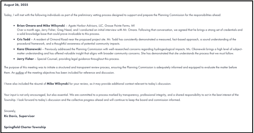 Below are independent notes prepared by Oko Environmental, LLC from the August 26, 2025 fact-finding meeting. These notes are provided for public information and transparency and do not replace official records maintained by Springfield Charter Township.